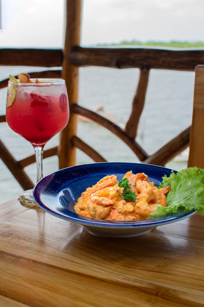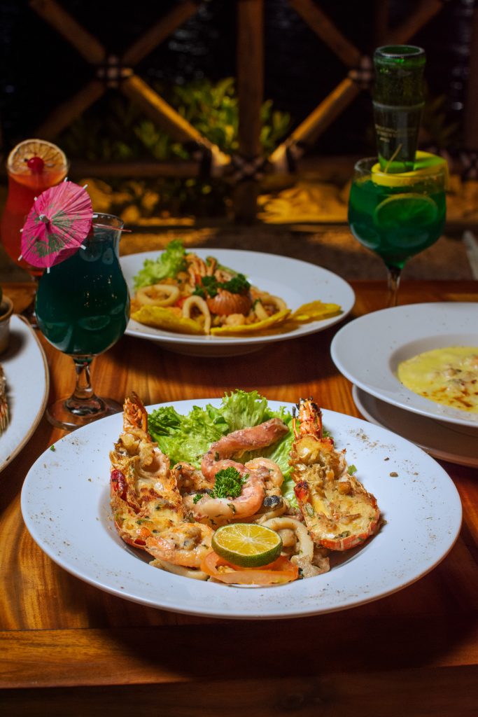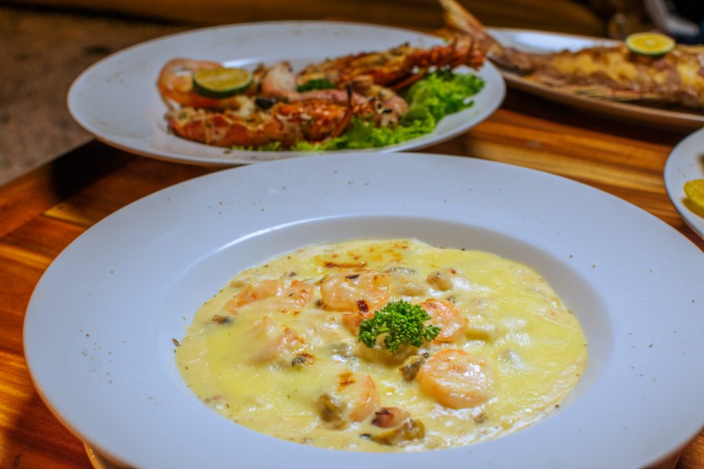 Mariscos en salsa de la casa gratinados, acompañados de arroz y patacones