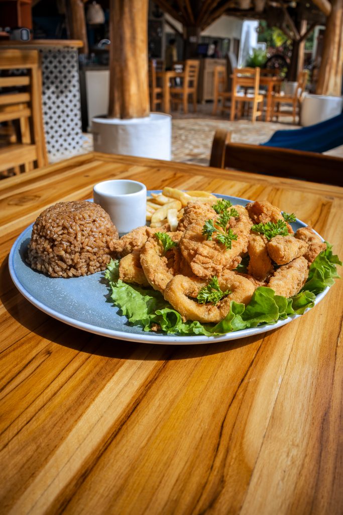 Langostinos apanados, trozos de pescado apanado y anillos de calamar apanados, acompañados de papas a la francesa y patacones