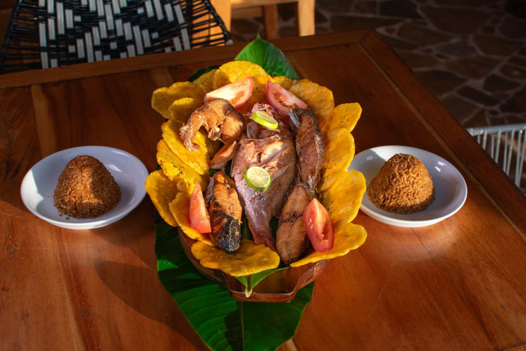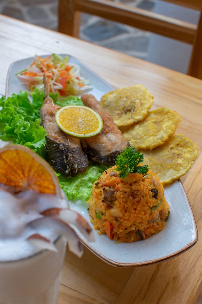 Pargo frito, medallones de robalo y sierra, acompañado de patacones y arroz con coco.