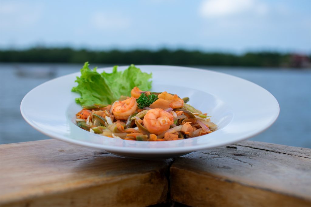 Mariscos salteados con verduras en salsa de soya y un toque de brandy